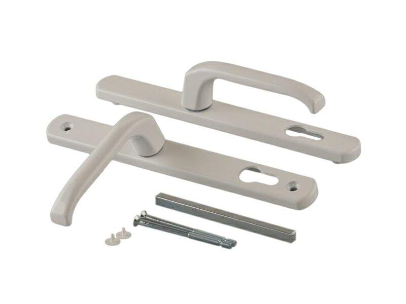 Данный дверной гарнитур выполнен из алюминия. Двусторонняя нажимная ручка зафиксирована на узкой сплошной накладке. Крепится с помощью двух стяжных винтов. В комплекте идут также декоративные накладки под винты.